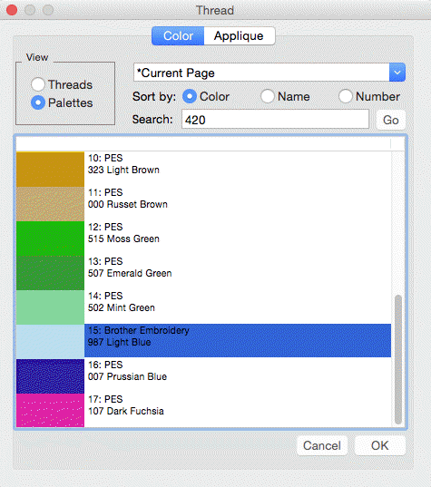 Design creators often need to utilize a palette of given colors. Sometimes these represent a customer’s job requirements, and other times it is merely a matter of needle assignment for the embroidery machine. You can create palettes at any time using the menu Utility->Threads… And you can choose to use any palette as you adjust the color properties.