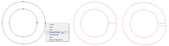 Sometimes you’ll need to turn a shape with a hole into a continuous outline, such as to make a satin stitch. To accomplish this, select two near points, one on the outline and one on the hole. Then use the context item, ‘Connect to hole.’ The hole is now part of the outline, as shown:
