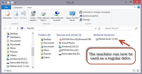 The configuration that the program does on the card is advanced and rather handy. It also sets up the card as a Mapped Network Drive on your computer. This way, the ‘machine’ will now appear as a drive in your Windows system: