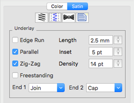 In the underlay properties, the “Edge Run” will create runs on either side of the satin, just inset by an amount controlled by the Inset field on the property page. The inset for the edge run is usually is set to fall just inside the stitching – perhaps a half-needle with or slightly more, which allows some relief around tight corners. The stitch length of the edge run is also adjustable; use smaller stitches for tight, narrow columns and longer ones if you want to reduce the stitch count, or are worried about cutting the fabric. The default is usually sufficient though.