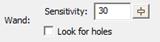 Because images differ in quality, when you click on the wand, the Sensitivity controls will appear. A low number of sensitivity means the pixels it is looking for will be very similar to the one on which you clicked. If you have an image with a mottled texture, for instance a piece of scanned fabric in the picture, you can make the sensitivity large, for example use 150, and the outline will be expanded to include more pixels to get a better outline.