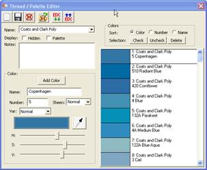 The color grabber tool lets you click in any window and pick up whatever color is under the cursor. This is very useful when you are building a thread palette from a document such as a .pdf or a thread manufacturer’s webpage. If you want to adjust the color visually, use the HSV (Hue, Saturation, Value) sliders until you get a color that you like.