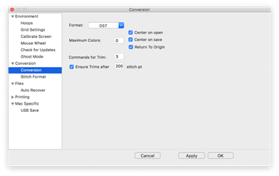 Designs can be saved into many different formats. The Conversion Preference allows you to adjust some parameters when you save in those different formats.