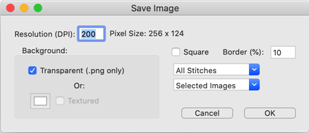 The image is created internally at a size based on the design size and then exported at the DPI you specify. You can use any image editing program to adjust size or save as a different image type, if desired. This utility is useful for putting designs on the web, in print, etc. The .PNG format allows a transparent background, and that is used to make compositions. Alternate to transparent, and available in all formats, is the ability to adjust the background color, and/or have a simulated fabric texture behind the image.