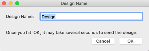 The design name will come from the design page name, but you will be given the opportunity to change it. Note that if the name matches a file on the machine, the name will get a (2) after it, or (3), etc. At present, there is no way to overwrite or delete a design file that’s on the machine.