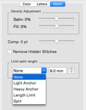 The ‘Limit Satin Length’ option is used to help prevent looping on top of the fabric and reduce ‘snag-ability’ from long satin stitches. There are several options to choose from when the lengths are long. An ‘Anchor’ is a simple run that’s placed every other line of stitching. This allows the alternating satin strokes to cover the added needle penetrations. The result is a reasonably smooth stitch, almost as smooth as a satin, but well tacked down, and not likely to snag or loop. ‘Length Limit’ is one traditional look to anchor the satin, and it will simply drop the needle whenever the stitch is too long. ‘Split’ will insert a needle land in the middle of any stitch that’s too long, which results in the look of a split-satin, or columnar appearance.