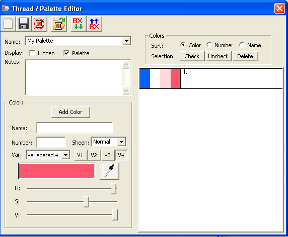 The Enthusiast version of the program adds the ability to create your own colors and add them to thread lines and palettes. To create a new thread or palette, click the ‘New’ button on the toolbar.