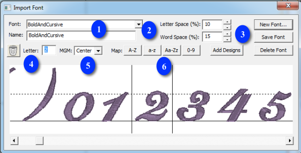 3. Here we have the buttons for adding a New font, Saving you mapped font, Deleting a font you have previously mapped and Add Designs to an existing mapped font.