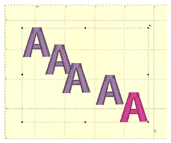 Distribution is different from alignment. Distribution places designs equidistant across a distance. This is useful if you want to make regular patterns, such as a tiled design. If you would like items distributed across an area, move the first and last items to the outside areas that you want to fill. In this example, the (top, left) ‘A’ and the (bottom, right) ‘A’ make the design size. But notice how the ‘A’ designs between those are not placed regularly? Distribute will make those ‘A’s into an orderly row: