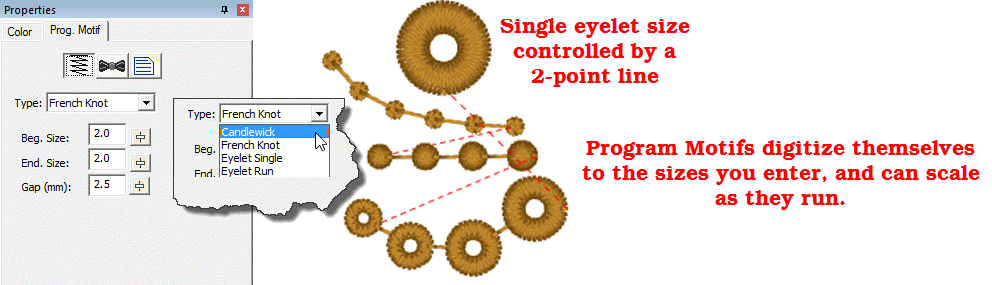The only real consideration when using these stitch types is that knots are dimensional and have been programmed to emulate their hand-stitch counterpart, therefore they tend to produce a lot of stitches.