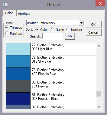 Design creators often need to utilize a palette of given colors. Sometimes these represent a customer’s job requirements, and other times it is merely a matter of needle assignment for the embroidery machine. You can create palettes at any time using the menu Utility->Threads… And you can choose to use any palette as you adjust the color properties.