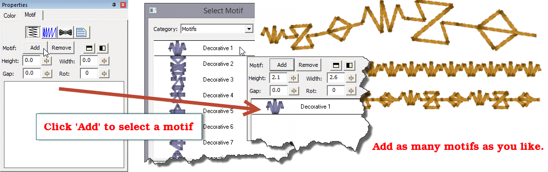 Motifs are used in Motif Runs and Motif Fills. The motif itself is a design, and can contain any number of Manual, Run and Satin objects, although usually a motif is a singular Manual stitch object. Naturally, a motif cannot contain another motif.
