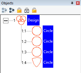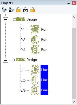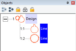 When observing the relationships between designs and objects, see that the Object View, normally docked on the right of the program screen, has at its ‘root’ level the designs, and when you expand a design, you’ll see the individual objects that compose that design. If you select a design, by clicking on it in the Object View, you will be selecting all the objects contained in that design as well. If you select all the objects in a design, selection of the design itself is optional. This is useful for copy/paste operations.