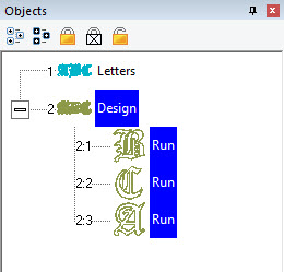 Objects are usually shapes that have stitch types and properties associated with them. The object may for instance be a Run, or a Satin Column or perhaps a Fill.