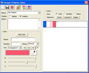 Click the ‘Add Color’ button to create a new color entry in the current thread / palette. Type in its name and thread number, if those exist, then adjust the color itself.