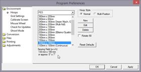 In the Preference window, under Environment, you can choose a hoop. Hoops are displayed in a sorted list, organized by embroidery file format. Most embroidery hoops are made using the metric system, so the sizes for the hoops are displayed according to the way the manufacturer sells the hoop. An approximate size in inches is also shown.