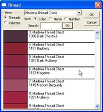 The next button, ‘Merge’ will open a thread window that lets you select one or multiple colors to be merged into the current palette. Also, there is a Delete button which removes any selected threads from the current palette.