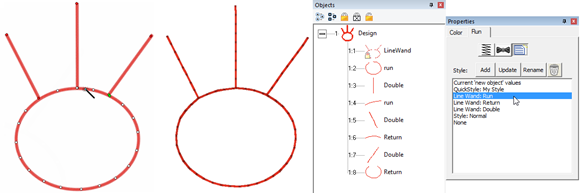 If you don’t want the entire design branched in this fashion, the objects created are editable – you can do what you like. Also, the objects have styles named for what they are doing within the path. By changing objects labeled ‘Run’ you are changing the run out – not anything with topstitches. Change the ‘Double’ for branches that are open-ended – they run out and back. Change the ‘Return’ for topstitching as the stitching comes back over itself.