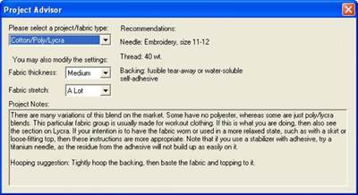 The Project Advisor is a patented expert system, a form of artificial intelligence, which helps you select stabilizer, needles and hooping techniques for many common projects.