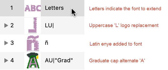 The simplest naming convention applies to extending a font. Extending a font is the process of adding glyphs that are missing in the original font, ex: language-specific characters. To extend a font, simply add the designs you want and name those according to the keystroke you wish to use. No other information is required.