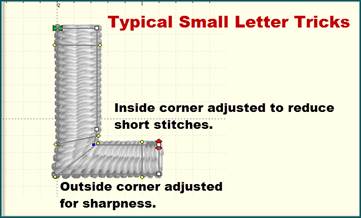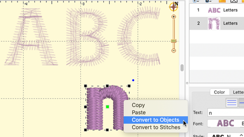 An example: As the size of a lettering design is reduced, the lowercase letter ‘a’ becomes distorted. A simple edit would help its appearance. Use ‘Convert to Objects’ on the ‘a’ at the reduced size in order to have a starting point. Something new could be digitized but be aware of the final size needed. Adjust the design to sew correctly at that size. Use the same name as the original, whether it is built-in to the font, an extension, a replacement, or an alternate.