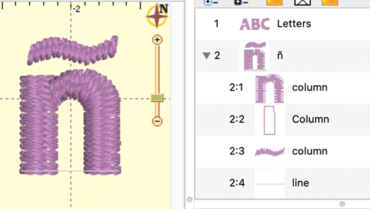 To extend a font, you can create a new design and digitize a letter, mark or glyph. Name the design with the keyboard key that will be used to access the design. For instance, if you’re extending the font with the Spanish enye letter( ñ ) simply type that as the design name.