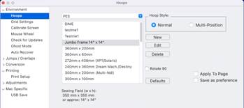 Note: If your program is licensed to use it, there is one hoop, the .PES Jumbo 14” hoop, is shown in both the Normal and Multi-Position section of the Hoop Preference. Using either selection will create the correct file for use with this hoop, however, the Normal version displays it as a single sewing field, and the Multi-Position version shows both fields in use.