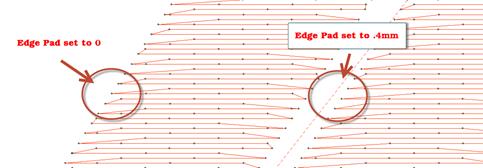 There are uses for fills that have much wider spacing between rows; trapunto effects for example. In a fill that has low density – where the stitches are really far apart -- you may want the traveling stitches to go along the outside of the shape, rather than under the rows where they would interfere with the desired visual effect. This is accomplished by checking the ‘Travel edge” box.