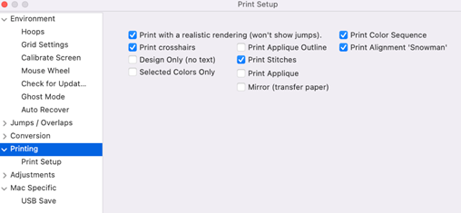 On the left are common options for printing templates. This includes 3D and crosshairs that mark the center of the design for hoop placement. Also, you can choose not to print design information (Design Only).
