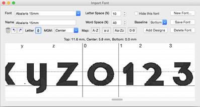 Lettering has a ‘Baseline’ which is an imaginary line where all the letters line up so that they are readable. The text you are currently reading has a baseline at the bottom of most letters. Some letters such as ‘j, y, p and q’ have ‘descenders’ that extend below the baseline. Sometimes a font, particularly a monogram, will use a baseline not at the bottom of the letters, but at the top (or more likely, center) of the text. Use the ‘Baseline’ drop box to change the baseline if you are importing a monogram font that should be centered vertically (center) or align at the top (Top).