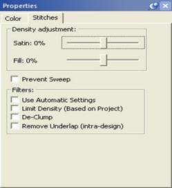 The DRK version of Embrilliance allows for more control of the stitches using our Project system. The Stitches property tab adds controls to use the project settings from the Project Advisor to remove stitching, De-Clump, and limit the density.