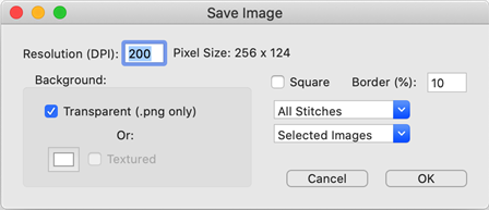 The image is created internally at a size based on the design size and then exported at the DPI you specify. You can use any image editing program to adjust size or save as a different image type, if desired. This utility is useful for putting designs on the web, in print, etc. The .PNG format allows a transparent background, and that is used to make compositions. Alternate to transparent, and available in all formats, is the ability to adjust the background color, and/or have a simulated fabric texture behind the image.