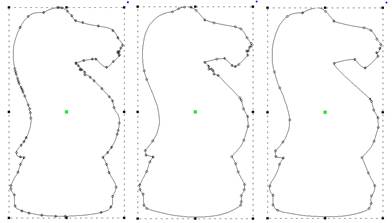 The menu Create > Outlines has Reconstruct Outlines to take vector shapes and try to recreate them with fewer points. If you’ve brought in something traced from a bitmap, it may have vector nodes every mm or so, making an impossibly ugly outline. Copy and paste a new one directly over the original. Sometimes it is useful to lock the original so as to avoid selecting/moving/editing it by accident.
