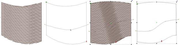 Here are some examples of curving fills in action. The stitches and the outline are shown side-by-side for each. Notice the curve on the right has an additional node added to produce an ‘S’ curve: