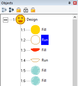Objects are usually shapes that have stitch types and properties associated with them. The object may for instance be a Run, or a Satin Column or perhaps a Fill.