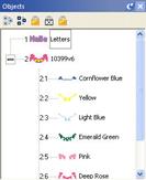 Notice that the designs are numbered in the Objects view. The designs or objects are numbered in the order that they have been opened or merged onto the design page. In the illustration above lettering was opened onto the Design Page first. So, it has been numbered 1. The following merged design is number 2 in the sequence. When re-sequencing objects the numbers will change accordingly.