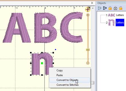 An example: As the size of a lettering design is reduced, the lowercase letter ‘a’ becomes distorted. A simple edit would help its appearance. Use ‘Convert to Objects’ on the ‘a’ at the reduced size in order to have a starting point. Something new could be digitized but be aware of the final size needed. Adjust the design to sew correctly at that size. Use the same name as the original, whether it is built-in to the font, an extension, a replacement, or an alternate.