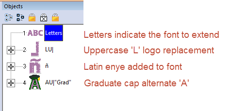 To create a letter replacement, digitize it at the glyph’s default size. For this purpose, it is often simplest to start with the existing letter. Create another letter design, setting the text to the glyphs you will replace. Use the Convert to Objects function. This is now a starting point, a design to be edited or referenced. Once the replacement letter digitized, name the design in the object tree. Letter replacements use the same name as the original, so that they can be typed in the same way, however, in order to let the system know this is a replacement letter, add the bar ‘ | ’ to the end of the letter name, ex: a|