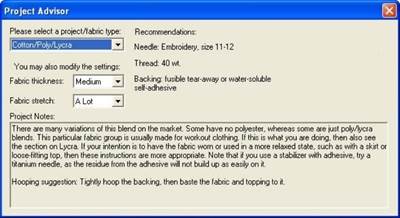 The system also provides instructions, helpful how-to advice and some words of caution when necessary. First, you select a project from the list. If your exact project or fabric is not listed, there are enough choices available where you can choose something very similar. Next, you can tell the Advisor if your fabric has more or less stretch, and you can adjust thickness. The Advisor takes your input in account as it makes its recommendations that are displayed as text in the window.