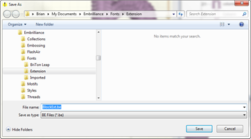 Letters/glyphs are each represented as a design on the design page, as seen in the preceding Publishing Fonts section of this manual. You can create designs and add them following the lettering design described above. How you name them will decide how the system uses them as described in the preceding ‘Naming of Extension Designs’ section.
