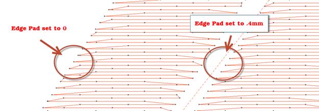 There are uses for fills that have much wider spacing between rows; trapunto effects for example. In a fill that has low density – where the stitches are really far apart -- you may want the traveling stitches to go along the outside of the shape, rather than under the rows where they would interfere with the desired visual effect. This is accomplished by checking the ‘Travel edge” box.