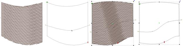 Here are some examples of curving fills in action. The stitches and the outline are shown side-by-side for each. Notice the curve on the right has an additional node added to produce an ‘S’ curve: