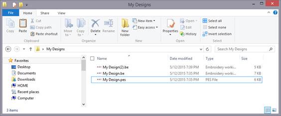 Embrilliance uses a few different file types, each having its own file extension. For example, ‘.BE’ is a working file. This file type contains all the Designs and Objects representing a single Design Page. These designs and objects can be edited, as they have not been forced to become a simple set of stitches, which is what most machine embroidery files are.