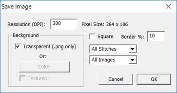 The image is created internally at a size based on the design size and then exported at the DPI you specify. You can use any image editing program to adjust size or save as a different image type, if desired. This utility is useful for putting designs on the web, in print, etc. The .PNG format allows a transparent background, and that is used to make compositions. Alternate to transparent, and available in all formats, is the ability to adjust the background color, and/or have a simulated fabric texture behind the image.