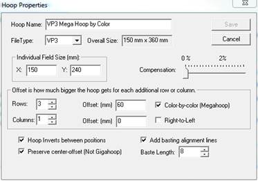 •   The ‘Rows’ field specifies the number of vertical points at which the hoop can be attached to your machine. For most multi-position hoops, this number is three. For sliding hoops such as those made by Hoop-It-All, you will have to determine how many sections you want to embroider in. In so doing, however, keep in mind that there should be a good overlap between adjoining sections. Use the hoops we’ve provided as examples.