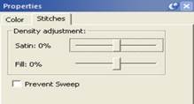 The stitch properties tab appears when a stitch design is selected. There are controls where you can add or remove up to 25% of the stitches by increasing or decreasing the density of the selected items. The slider controls will separately allow the adjustment of satin stitching and fill stitching, which allows very specific control.