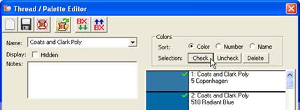 You can mark threads that you have in your personal inventory using the ‘Check’ and ‘Uncheck’ buttons: