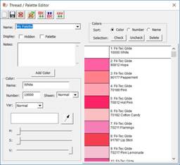 The Thread / Palette Editor provides a place for you to manage which threads you own, create smaller palettes for specific projects, and even share those palettes with others.