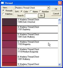 The next button, ‘Merge’ will open a thread window that lets you select one or multiple colors to be merged into the current palette. Also, there is a Delete button that removes any selected threads from the current palette.