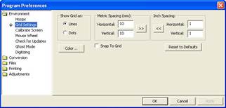• The Grid is adjustable too. You can alter the display of gridlines by choosing between lines and dots. You can also set the spacing of the grid, and that can be set separately for both metric and inch settings.